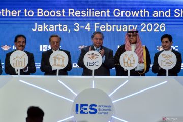 Menteri Koordinator Bidang Perekonomian Airlangga Hartarto (tengah) bersama Ketua Dewan Pengawas Indonesia Business Council (IBC) Arsjad Rasjid (kanan), CEO IBC Sofyan Djalil (kiri), President of the Islamic Chamber of Commerce and Development (ICCD) Abdullah Saleh Kamel (kedua kanan) dan Premier Sarawak Datuk Patinggi Tan Sri Abang Haji Abdul Rahman Zohari bin Tun Datuk Abang Haji Openg (kedua kiri) bertepuk tangan usai membuka Indonesia Economic Summit (IES) 2026 di Jakarta, Selasa (3/2/2026). IES 2026 yang diselenggarakan 3-4 Februari 2026 tersebut merupakan wadah strategis bagi mitra global untuk memperoleh pemahaman terkini mengenai arah kebijakan ekonomi dan prioritas pembangunan Indonesia. ANTARA FOTO/Putra M. Akbar/wsj.
